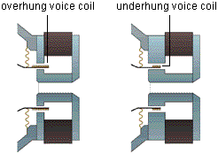 - voice coil & former – the voice coil is a coil of wire, usually copper or aluminum, through which the electrical audio signal flows. The flowing current of the audio signal alternates, creating an electromagnetic field which is opposed by the permanent magnetic field of the magnet circuit. This causes the voice coil and diaphragm to move. Some drivers have two (dual) voice coils to provide various wiring options, including the ability of simultaneously connecting two different signals to the driver. Voice coils can be "overhung" or "underhung" as shown below: