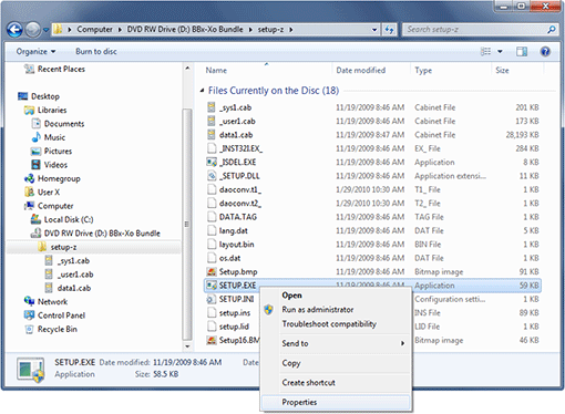 Right-click on the "setup.exe" file and select "Properties" from the popup menu as shown below: