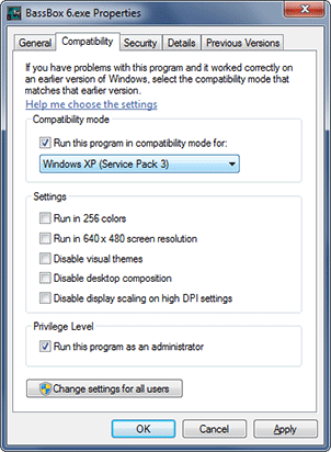 - Check "Run this program in compatibility mode for:" at the top of the dialog and choose "Windows XP (Service Pack 3)" for the mode.