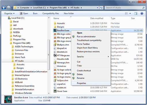Or you can use the Windows Explorer (Windows key+E) to navigate to the place where the BassBox 6 Pro program file (BassBox 6.exe) is stored on your computer's hard drive and right-click on it there. This will usually be at "c:\Program Files\HT Audio" for 32-bit versions of Windows or "c:\Program Files (x86)\HT Audio" for 64-bit versions (shown below).
