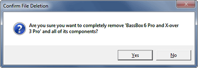 If a message similar to the one shown below appears, it indicates that a system file that was installed with BassBox Pro and X•over Pro does not appear to be needed any more. Respond by clicking "Yes to All" so that all unneeded system files that were installed with the programs are removed. Remember, you are about to reinstall the programs and the system file will be reinstalled with them. Removing it here is a good idea to insure that dependent files are properly installed and linked during the next attempt to install the program.