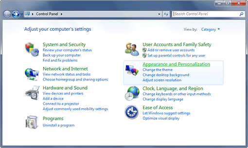 If, on the other hand, BassBox 6 Pro and X•over 3 Pro do not appear in the Uninstall list (or the setup program was unable to finish during the previous attempt to install them), then you will need to manually check to see if the programs and/or their folders were installed on your computer. If they were, then you should delete them. However, before this can be done, you must configure Windows to show its hidden system files and folders. To do this, launch the Windows Control Panel again from the Windows Start menu unless it is still open. Then click on "Appearance and Personalization" (highlighted below).