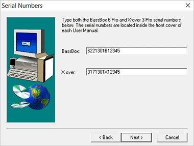 Enter the serial number for each program in the Serial Numbers dialog shown below. In the case of BassBox Pro and X•over Pro, their serial numbers are located inside the front cover of their respective printed User Manual. The BassBox Lite serial number is located on the back of its CD case. Each serial number consists mostly of numbers—however there will be one letter in the middle and sometimes one or two letters on the end. Usually all "0" are zeros and not the letter "o". The serial numbers are not case sensitive and you can use upper or lower case. Click on the "Next" button to continue.