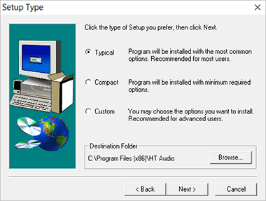 - The Setup Type dialog will appear next as shown below. We strongly recommend that you do NOT change these settings. Use the default "Typical" installation and use the default Destination Folder (usually "C:\Program Files\HT Audio" for 32-bit versions of Windows and "C:\Program Files (x86)\HT Audio" for 64-bit versions of Windows). BassBox Pro, BassBox Lite and X•over Pro may not function properly if you use a different Destination Folder. Click on the "Next" button to continue.