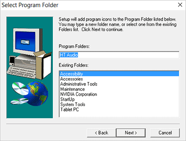 - The Select Program Folder dialog will appear next as shown below. This setting is less critical, but again, we recommend that you use the default setting. Click on the "Next" button to continue.