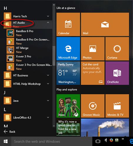 - If a program is still not listed, scroll down the list of programs to the "HT Audio" folder and click on it. The program will be listed there as shown below. Click on it to launch.